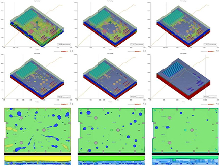 Moldex3D 可预测灌封过程中气泡行程和包封位置,有助选择最适合的材料和最佳的制程参数及制程优化。灌封后的后熟化分析,可深入了解固化时间、化学收缩、及因黏弹性效应引起的应力释放。